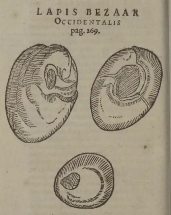 Abb. 7: Lapis Bezaar aus: Caspar Bauhin, De Lapidis Bezaar Orient. Et Occident. Cervini Item Et Germanici Ortv, Natvra, Differentijs, Veróque vsv Ex Veterum & Recentiorum placitis Liber, Basel 1613