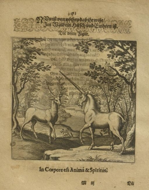 In die Alchemie hielt das Einhorn mit dem „Buch Lambspring“ Einzug. Im dem alchemistischen Lehrgedicht wird ausgeführt, wie die flüchtigen Komponenten eines Stoffes, Geist (Spiritus) und Seele (Anima), vom festen Körper (Corpus) getrennt, geläutert und anschließend wieder zurückgeführt werden. 1625 erschien dieser Text zum ersten Mal in gedruckter Form.[13] Matthäus Merian d. Ä. hatte hierfür 17 allegorische und sehr einprägsame Bilder geschaffen. Geist und Seele erscheinen hier in Gestalt eines Einhorns und eines Hirschs (Abb. 10). Der Wald, in dem die Begegnung der beiden edlen Wesen stattfindet, symbolisiert den Körper: „Nun ists auch recht / daß der Der sie künstliche zu Zähmen weiß / Außm Wald zuführen / widrum drein treibn Daß sie beynander bleiben müssen (…)“ lauten die verrätselten Verse, die sich nur dem Alchemie-Kundigen erschließen. Übertragen auf die praktische Alchemie mag man hier die beiden alchemistischen Grundprinzipien Mercurius (Einhorn) und Sulphur (Hirsch) erkennen, die es im Laboratorium miteinander zu verbinden gilt.[14] Der Triumphzug des Einhorns in der Alchemie läutete zugleich seinen Rückzug aus der Zoologie ein – es kehrte in den Bereich der Mythen und Legenden zurück.[15]