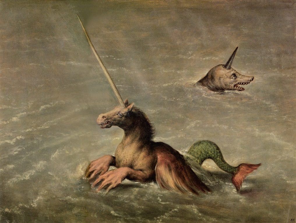 Mit dem beginnenden Fernhandel mit Asien im 13. Jahrhundert mehrten sich die Berichte von wundersamen, behörnten Geschöpfen. Marco Polo hatte Tiere beschrieben, die Elefanten ähnelten, aber nur ein einziges Horn trugen. Was er gesehen hatte, waren Nashörner. So kam es, dass das Rhinozeros mit dem Einhorn in der europäischen Vorstellung vermischt wurde.[6] Das, was gemeinhin als Horn des Fabelwesens gehandelt wurde, war in der Tat oft das Horn eines Rhinozeros. Im 16. Jahrhundert begann man die Existenz des behörnten Pferdes jedoch zunehmend in Frage zu stellen und vermutete den Ursprung des begehrten Horns im Meer. Und tatsächlich handelt es sich bei dem spiralförmig gedrehten Horn um den Stoßzahn eines Narwals. Wie die Vorstellung von „Meer-Einhörnern“ die Phantasie noch mehr beflügelte, zeigt diese Darstellung aus einem Tierbuch, das für Kaiser Rudolf II. (1552–1612) angefertigt wurde. Hier sind zwei Mischwesen zu sehen, die jeweils ein Horn auf der Stirn tragen: Ein Pferd mit dem Körper eines Fischs und ein robbenähnliches Tier (Abb. 3).[7]