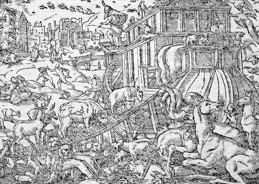 Abb. 4: Tobias Stimmer, Die Tiere besteigen die Arche, Holzschnitt, aus: Biblia sacra veteris et novi testament, secundum editionem vulgatam, Basel 1578