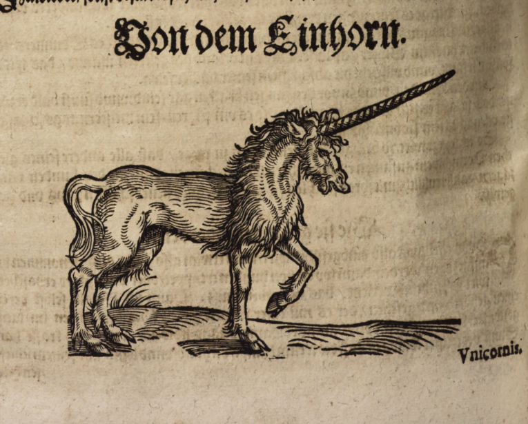 Abb. 5: Von dem Einhorn, Holzschnitt, aus: Conrad Gessner, Thierbuch. Das ist Außführliche beschreibung und lebendige ja auch eigentliche Contrafractur … aller Vierfüssigen thieren, so auff der Erden und in Wassern wohnen, Heidelberg 1606