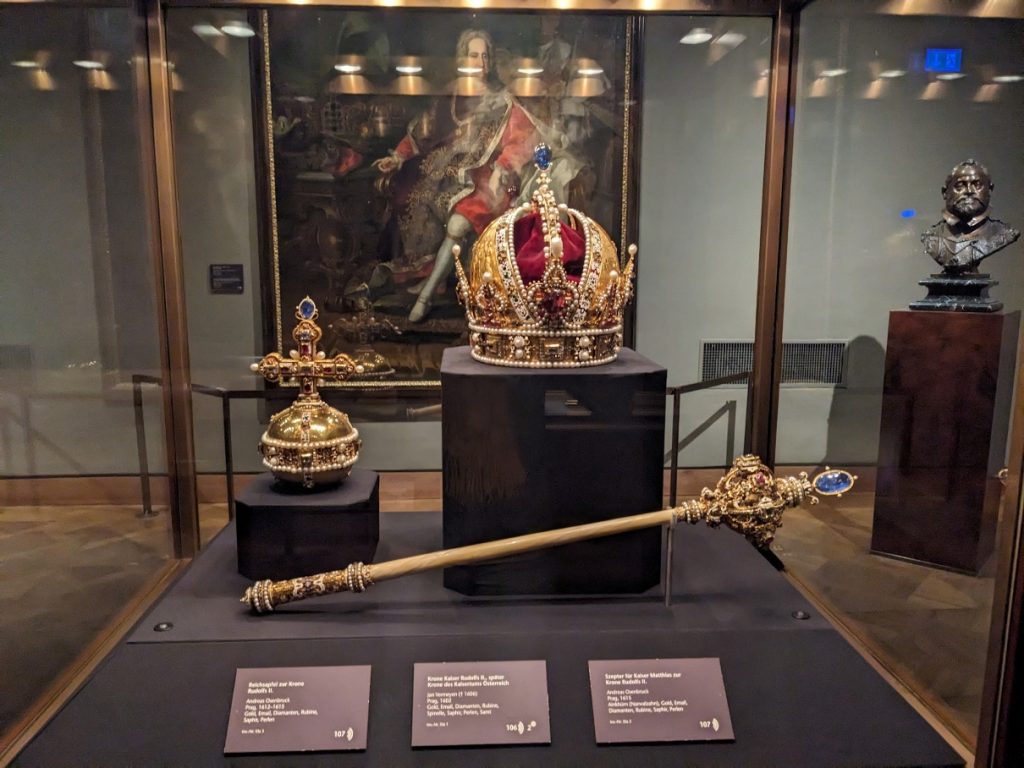 Abb. 9: Andreas Osenbruck, Das Szepter (mit Reichskrone und Reichsapfel), 1615, Narwalzahn, Gold, teilweise emailliert, Diamanten, Rubine, Saphir, Perlen, 75,5 cm, Wien, Kunsthistorisches Museum, Inv. Nr. Schatzkammer WS XIa 2