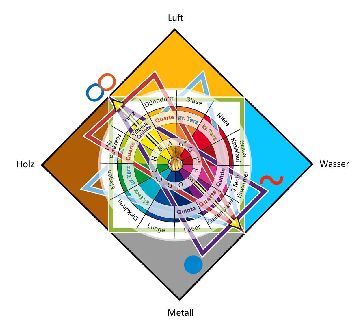Genau wie die Alchemie beschreibt Dr. Arno Heinen, der Entwickler des Systems der Stimm-Frequenz-Analyse, den Wandlungs- und Entwicklungsprozess als einen vierphasigen Prozess. Ausgedrückt wird das im Siegel (oben) von Dr. Arno Heinen analog zum alchemistischen Siegel von Josef Lüthi (unten). Im Fall von Dr. Heinen sind dies die Elemente Holz, Luft, Wasser und Metall. Das Feuer, das zu Beginn dieses Prozesses an das Holz angelegt wird, entsteht aus der Dreiecks-Beziehung, in der sich Materie (blauer Punkt) und Geist (rote Welle) polar gegenüberstehen. Die Wandlung von Materie führt so immer zu freier Energie, die Wandlung von Geist immer zu freien Informationen. Freie Energie und freie Information verschmelzen zu einem Feuer (siehe liegende Acht), das die Wandlung und Entwicklung in einem 4-phasigen Prozess vorantreibt. Symbolisiert wird dies durch das sogenannte Quintendreieck aus Grundton (1. Harmonische in der Stimm-Frequenz-Analyse), großer Terz und Quinte. Dieser Dreiklang führt zu einem neuen Sein, in der Alchemie als Quintessenz bezeichnet. Im Zyklus von 2 Stunden wird jeder der 12 Töne der Tonleiter jeweils einmal zum Grundton. Dabei leuchtet jeder Meridian tonbezogen in der entsprechenden Farbe. Die Meridiane sind im Organismus das Kanalsystem, durch das Energie und Informationen transportiert werden. Während 24 Stunden wandeln und entwickeln sich somit alle Organe des Organismus. Die 12 Sequenzen fügen sich zusammen zu einer 24-Stunden-Sequenz, die tägliche Wiederholung führt zu einem Rhythmus, der die Wandlung und Entwicklung zu einer Ewigkeit werden lässt.