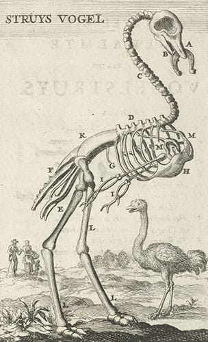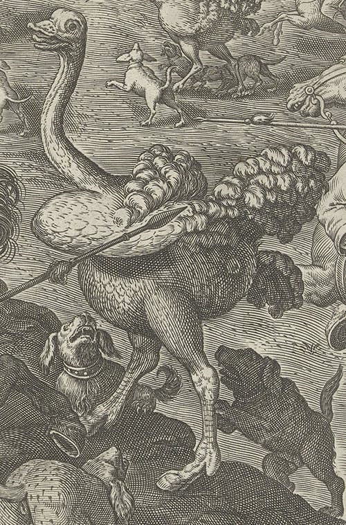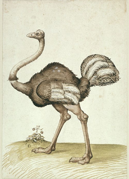 Während die großen und deshalb begehrten Eier auf Handelswegen über Italien und Spanien nach Europa gelangten, musste man aber auch im späten Mittelalter und in der Frühen Neuzeit nicht bis nach Afrika reisen, um lebendige Strauße zu sehen. Spätestens seit dem 10. Jahrhundert hat man sie als exotische Kuriosität an Fürstenhöfen in Privatzoos, in sogenannten Menagerien, gehalten. [7] Dort wurden sie sowohl von naturkundlich Interessierten als von Künstlern eingehend studiert (Abb. 9). So korrigierten sich Fehler in der Wiedergabe des Vogels, die sich durch Beschreibungen von Plinius und dessen Nachfolgern eingeschlichen hatten. Die ungewöhnlichen zweizehigen Füße, die Plinius mit denen von Paarhufern verglichen hatte, waren oft missverstanden und tatsächlich als Hufe wiedergegeben worden (Abb. 10). Dazu trug sicher auch bei, dass der Strauß im Lateinischen aufgrund seiner Größe und Schnelligkeit bis heute als „Kamelvogel“ (Struthio camelus) bezeichnet wird.