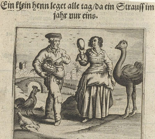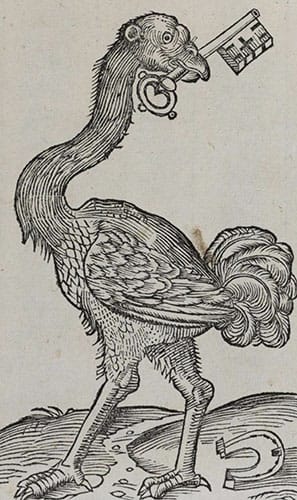 Plinius spricht zwei Punkte an, die den Strauß teilweise bis heute begleiten. Einerseits ist da der Mythos vom Vogel, der den Kopf sprichwörtlich in den Sand steckt. Andererseits wurde gern behauptet, dass der Strauß alles verschlingen und verdauen könne, neben Steinen sogar Eisen. Ersteres ist leicht zu erklären: Strauße verbringen viel Zeit damit, auf dem Boden nach Nahrung zu picken. In der flimmernden Wüstensonne Afrikas muss das aus der Ferne den Anschein erweckt haben, das Tier habe den Kopf in den Sand gesteckt. Mit kopflosem Fluchtverhalten hat dies also nichts zu tun. Dass der Strauß nicht nur einen, sondern sogar zwei äußerst robuste Mägen hat, entspricht hingegen der Realität. In der Tat nimmt der Vogel mit der Nahrung absichtlich Steine – sogenannte Gastrolithen – auf, um Faserhaltiges besser verdauen zu können. Eisen steht eigentlich nicht auf dem Speiseplan des Tiers, allerdings hat es eine Vorliebe für glänzende Oberflächen und könnte versehentlich metallene Objekte verschlingen [2]. So entwickelte sich die Vorstellung vom Allesfresser Strauß. Die Stärke des Straußenmagens fand Eingang in die Darstellungstradition des Tiers: Es etablierte sich das Bild des Straußenvogels mit einem eisernen Schlüssel oder Hufeisen im Schnabel (Abb. 2 und 3).