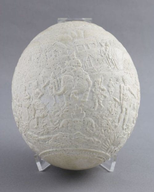 Ebenso wie über das Verhalten des Vogels staunte man über dessen riesige Eier (Abb. 4). Zum Vergleich: Während ein Hühnerei ca. 60 g wiegt, bringt ein Straußenei 1,3 kg auf die Waage. Der Inhalt eines Straußeneis entspricht 24 Hühnereiern. In freier Wildbahn legen Weibchen in einer Brutgemeinschaft, die aus einem Hahn und mehreren Hennen besteht, im Zeitraum zwischen März und Juli ca. 12–15 Eier. Wie bereits Plinius mitteilte, verarbeitete man die Eierschalen oft zu Kunstwerken und Gebrauchsgegenständen. Die 2–3 mm dicke Schale lässt sich aufwendig schnitzen oder gravieren (Abb. 5 und 6). Das Ei wurde gerne auch gefasst und zu Pokalen verarbeitet, die dann als begehrte Schaustücke in Kunst- und Wunderkammern Eingang fanden. Ebenso wie über das Verhalten des Vogels staunte man über dessen riesige Eier (Abb. 4). Zum Vergleich: Während ein Hühnerei ca. 60 g wiegt, bringt ein Straußenei 1,3 kg auf die Waage. Der Inhalt eines Straußeneis entspricht 24 Hühnereiern. In freier Wildbahn legen Weibchen in einer Brutgemeinschaft, die aus einem Hahn und mehreren Hennen besteht, im Zeitraum zwischen März und Juli ca. 12–15 Eier. Wie bereits Plinius mitteilte, verarbeitete man die Eierschalen oft zu Kunstwerken und Gebrauchsgegenständen. Die 2–3 mm dicke Schale lässt sich aufwendig schnitzen oder gravieren (Abb. 5 und 6). Das Ei wurde gerne auch gefasst und zu Pokalen verarbeitet, die dann als begehrte Schaustücke in Kunst- und Wunderkammern Eingang fanden.